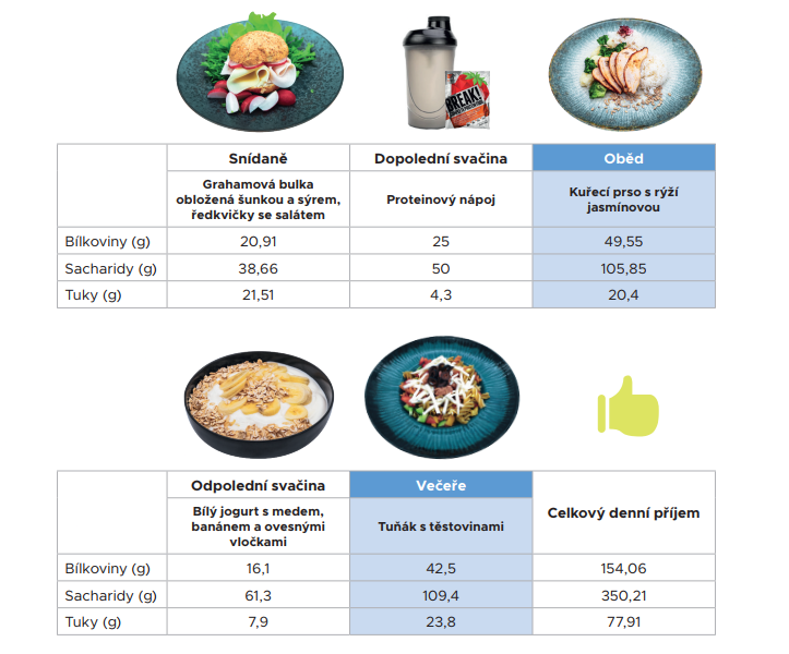 Základem a největším zdrojem příjmu potravin jsou během dne hlavní chody, tedy obědy a večeře, které většinou tvoří až 65% celodenního objemu jídla. Na ty jsme se zaměřili, abychom tak vytvořili dobrý základ pro tvé celodenní stravování. Protože je ale každý člověk unikátní, má svou váhu a své vlastní cíle, zbývají ještě další denní chody (ideálně snídaně a dvě svačiny), v rámci kterých si každý může dopočítat své hodnoty bílkovin, sacharidů a tuků. Modelový jídelníček na jeden den je dále.